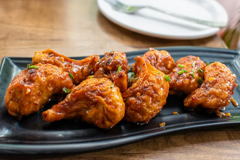 Spicy, tangy, battered chicken drumsticks served with spicy Szechwan sauce.