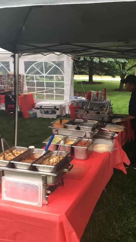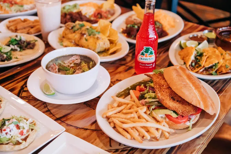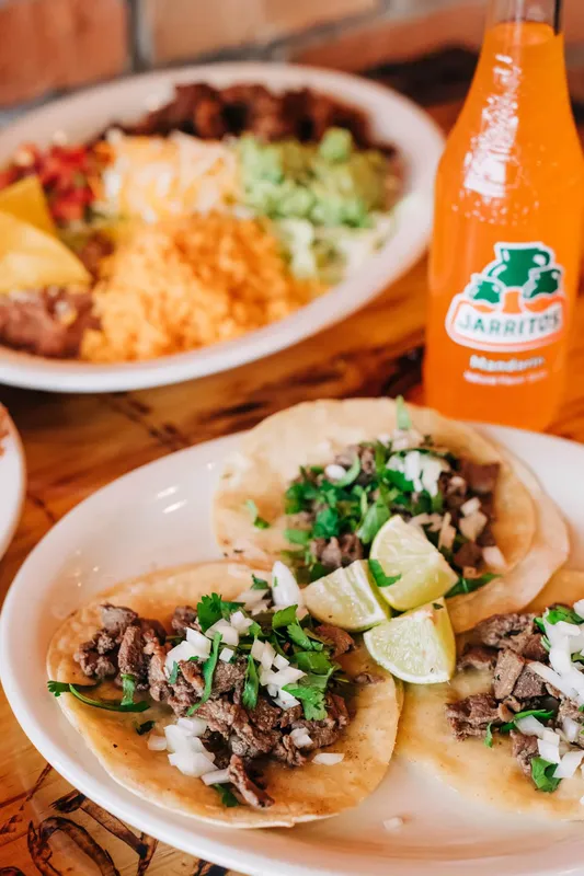 Taco bar mexican (rice, beans, onions, cilantro and limes) 2 types of sauce.