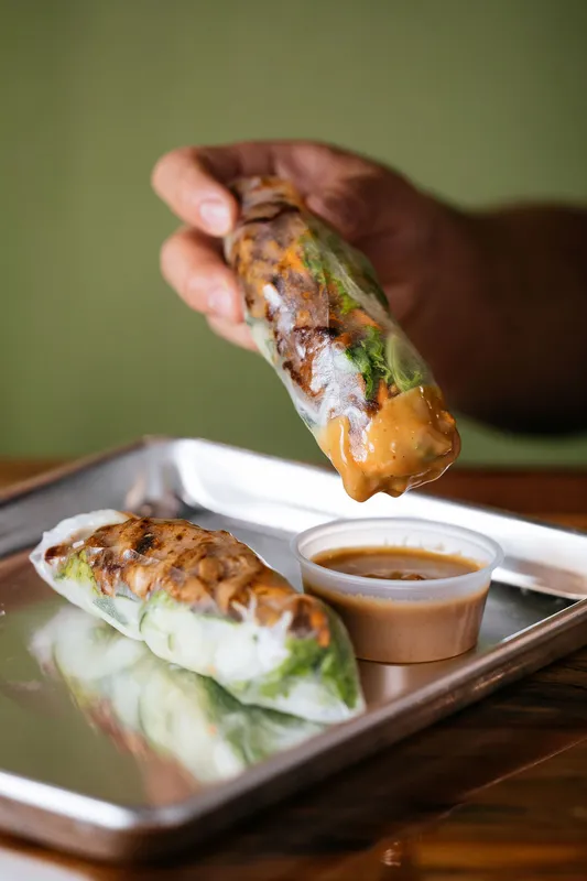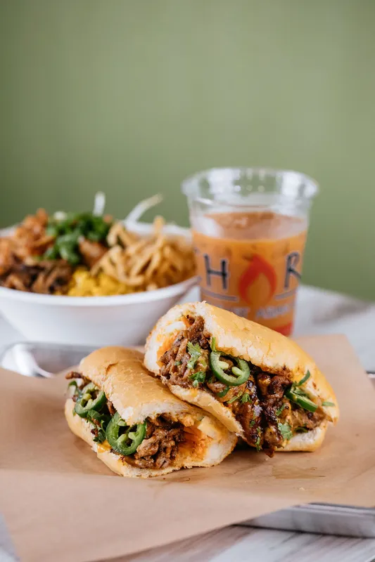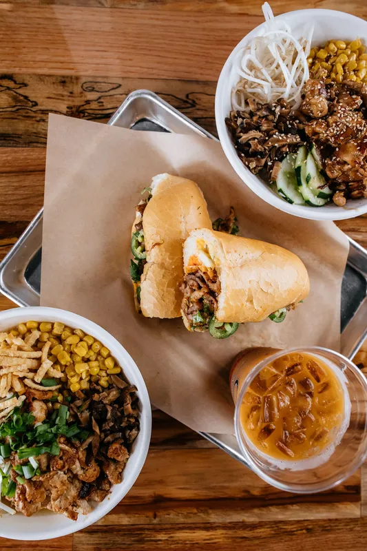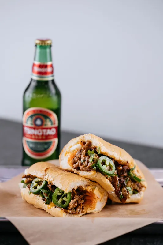 Steamed bread named Mantou, filled with your choice of protein, spinach, pickled carrots and daikon, drizzled with firecracker sauce and cilantro