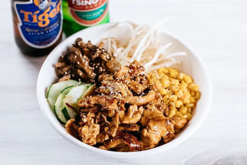 Literally Means Mixed ricw, Korean Inspired Sliced Beef With White Rice And Sauteed Sweet Onions, Homemade Kimchi, Sweet Roasted Corn, Roasted Sesame Seeds, Crispy Shallots, And a fried egg to Top The Bowl Off. Sweet and Spicy Gochujang Sauce