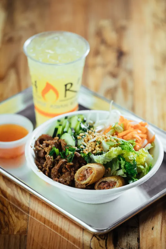 Savory Charred Pork Seasoned In Traditional Vietnamese Spices On Top Of White Rice Or Vermicelli Noodles Accompanied By Fresh Cucumbers, Romaine Lettuce, Bean Sprouts, Pickled Carrots And Daikon Topped With Roasted Peanuts. With Your Choice Of Sweet And Salty Fish Sauce Or Creamy Peanut Sauce