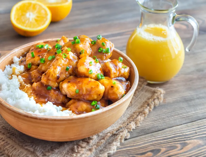Crispy Chicken Pieces Glazed In A Chef'S Creation Tangy Orange Sauce. A Crowd Favorite.