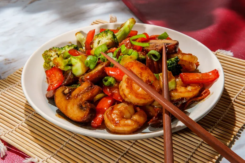 Your Choice Of Shrimp Or Fish Stir-Fried Prepared In A Bold Hunan Sauce Along With Hot Pepper, Baby Corn, Carrot, Mushroom, Bell Pepper And Water Chestnut.