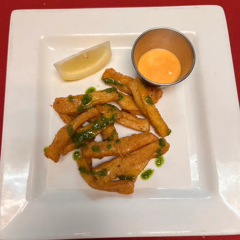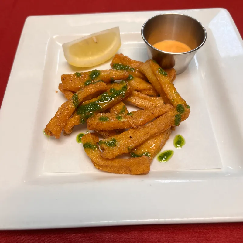 Crispy Fried Saffron Poached Cauliflower Tossed With Citron Pepper, Parsley Oil And Citrus Aioli.