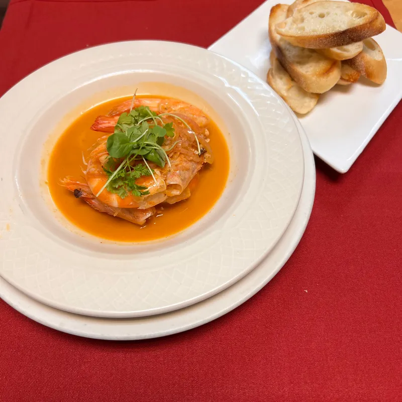 Spanish Style Meat Balls Served In A Saffrontomato Broth And Grilled Bread.