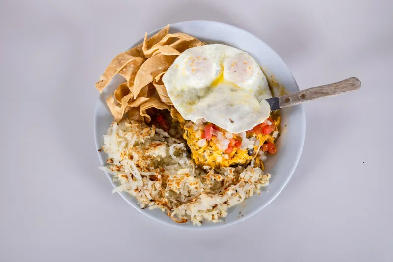 Three eggs on two corn tortillas covered with green chili, roasted salsa, and cheese. Served with refried beans and hash browns.